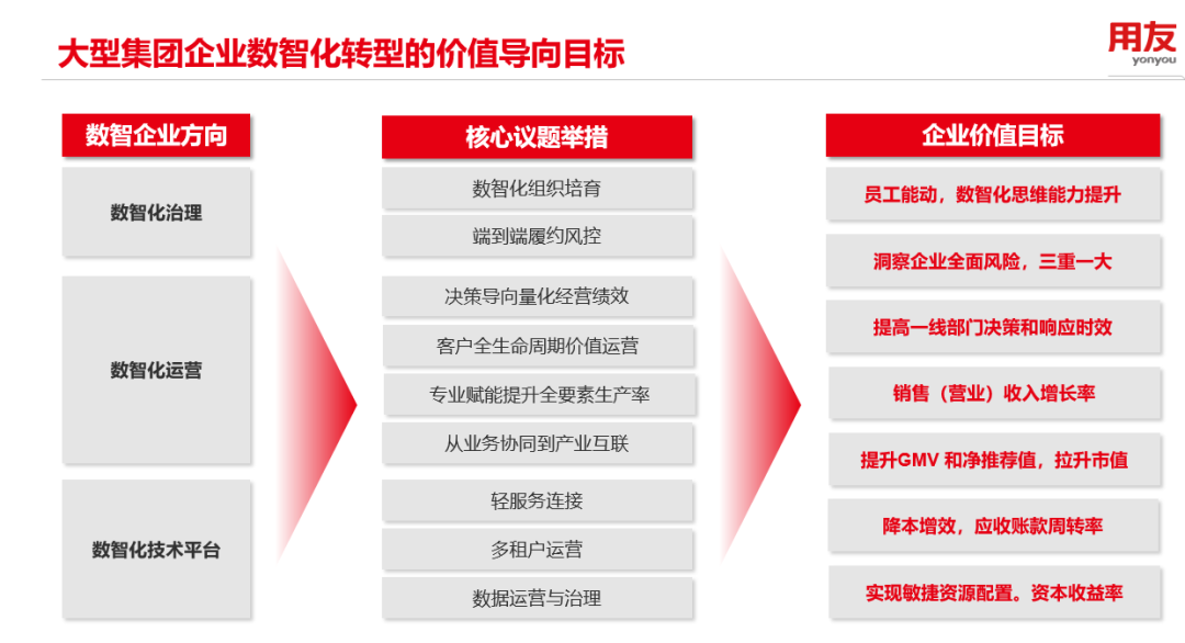 用友認為,大型企業(yè)在需求重塑、產(chǎn)業(yè)調整、政策升級等多重變革力量交織下,數(shù)智化轉型難度與日俱增。對于這項復雜而漫長的工作來說,明確價值導向將助推企業(yè)拾級而上。